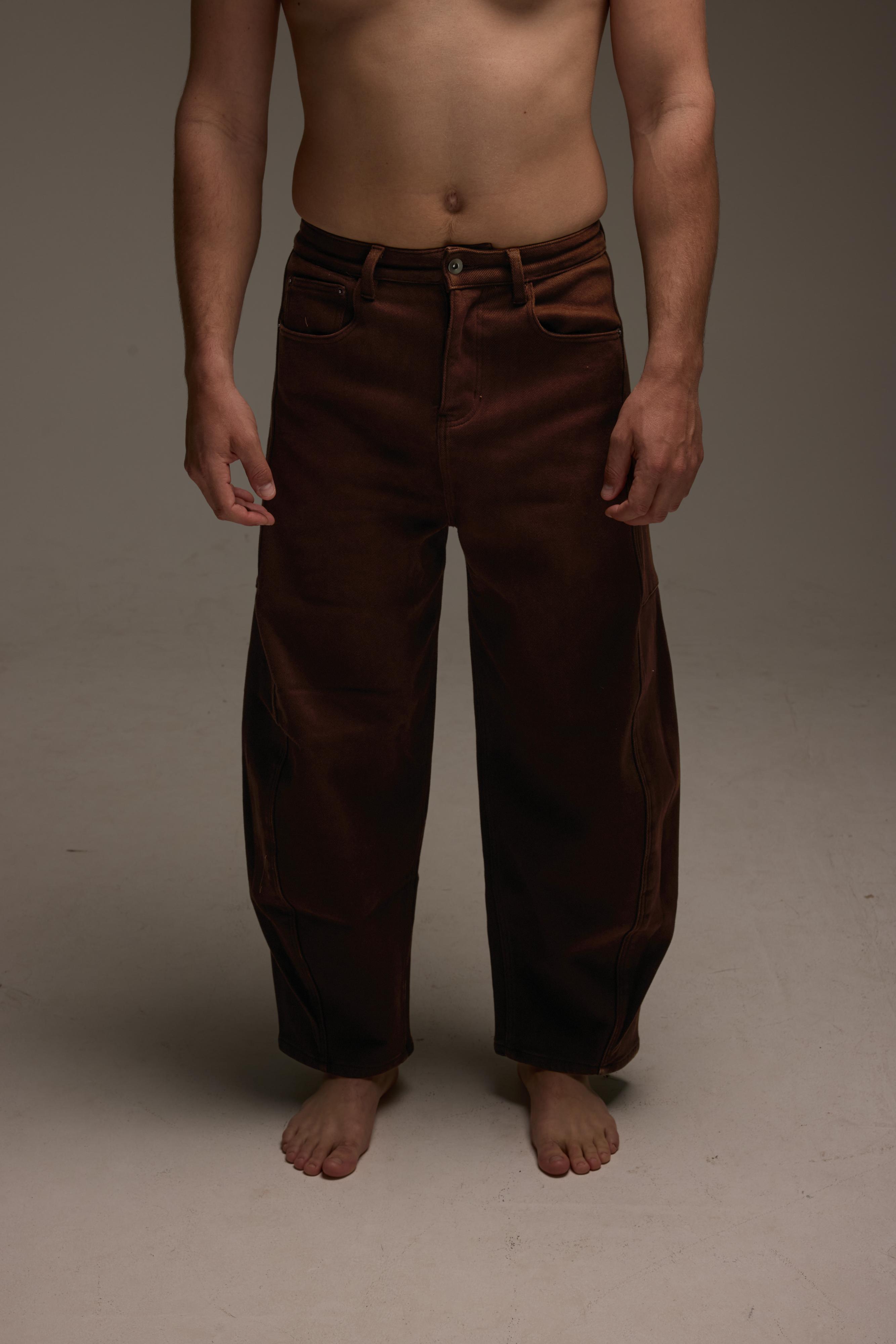 מכנס דנים בגוון חום שוקולד עם גזרה ישרה רחבה ומראה מחוספס ואלגנטי. עיצוב קלאסי עם כיסים קדמיים ואחוריים שמעניק לוק גברי מודרני שמתאים לשילוב יומי מוקפד
