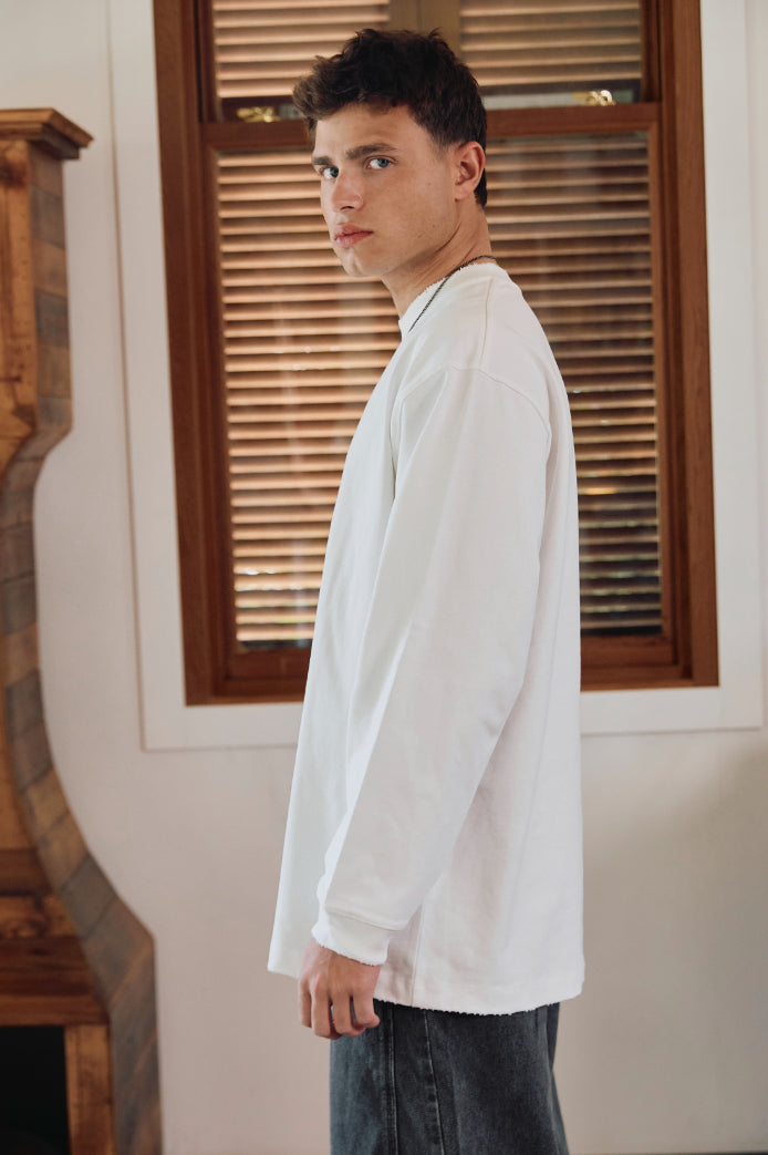 טי שירט לבנה עם שרוול ארוך מבד עבה וגזרה ישרה. עיצוב נקי ומינימליסטי שמעניק מראה מודרני ומשתלב בקלות בכל לוק יומי