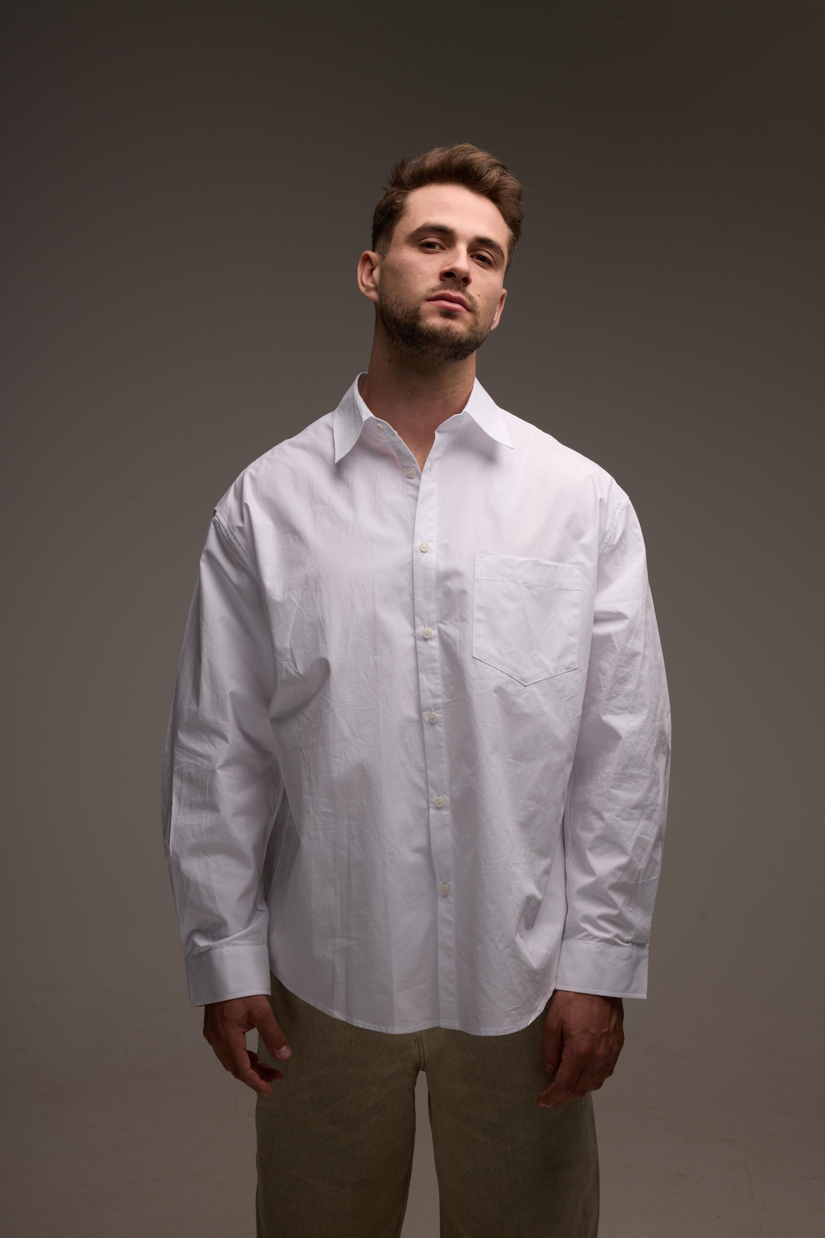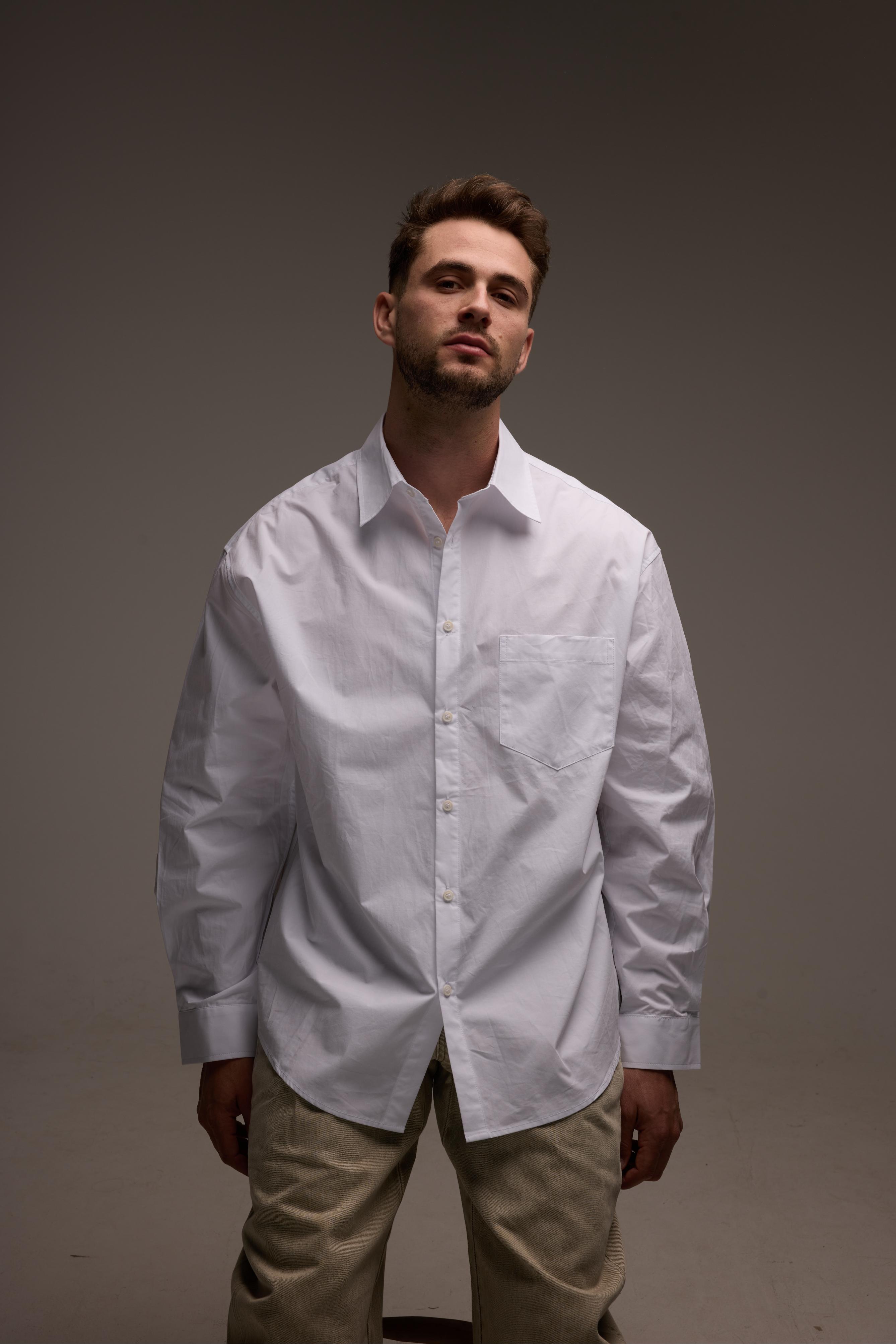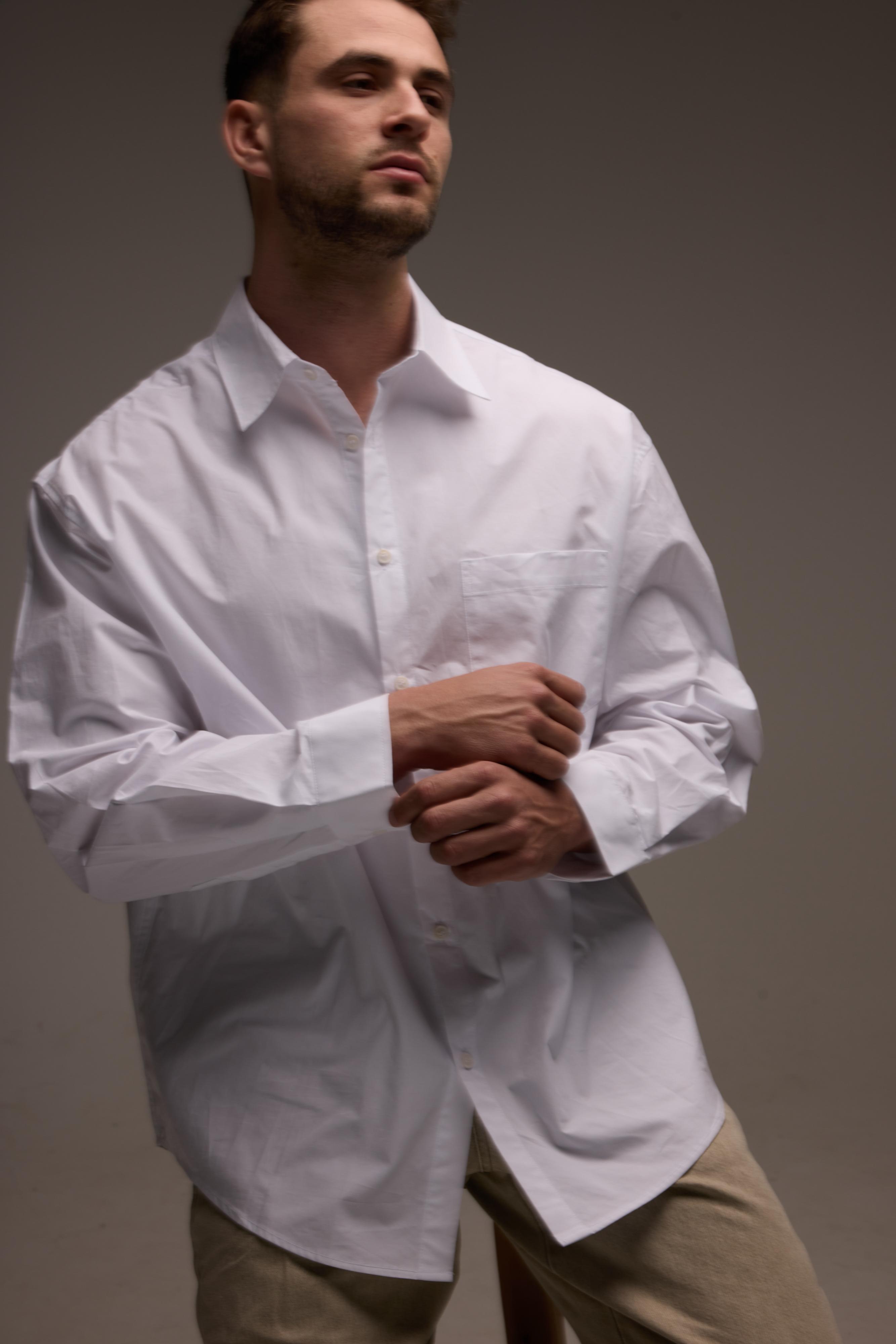חולצה מכופתרת לבנה עם גזרה מודרנית ונקייה שמעניקה מראה אלגנטי. פריט קלאסי שמתאים ללוק גברי מוקפד ולסטייל על זמני.