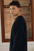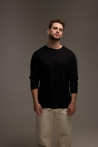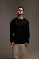 טי שירט שרוול ארוך מבד עבה בגוון שחור עם קו נקי וגזרה מודרנית. פריט בסיס על זמני שמתאים ללוק יומי מוקפד ומשתלב בקלות בכל שילוב