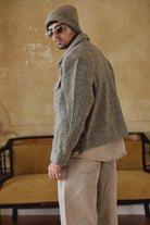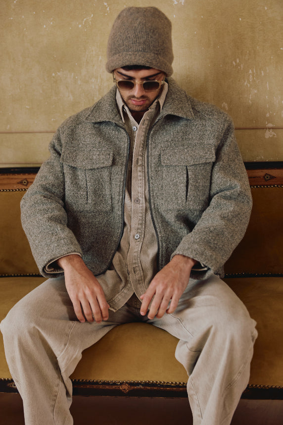 ג׳קט בגוון אפור עשוי בד צמר עם מרקם עשיר שמעניק עומק ומראה מובנה. כולל כיסי חזה ורוכסן קדמי ויוצר שילוב בין קווים נקיים לאופי מחוספס
