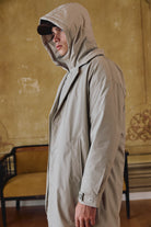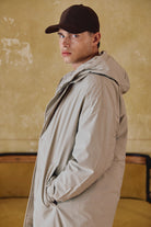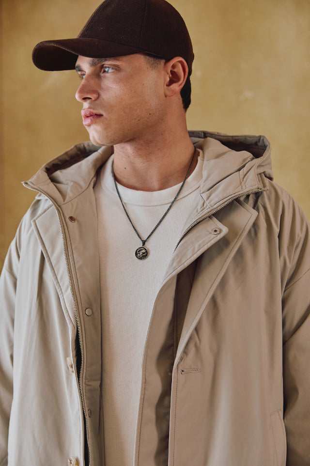 מעיל ארוך בגוון חול עם קפוצ׳ון וכיסים צדדיים. פריט עם מראה מודרני שמוסיף עומק ללוק ומשלב פונקציונליות עם סטייל גברי נקי