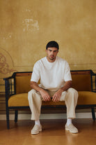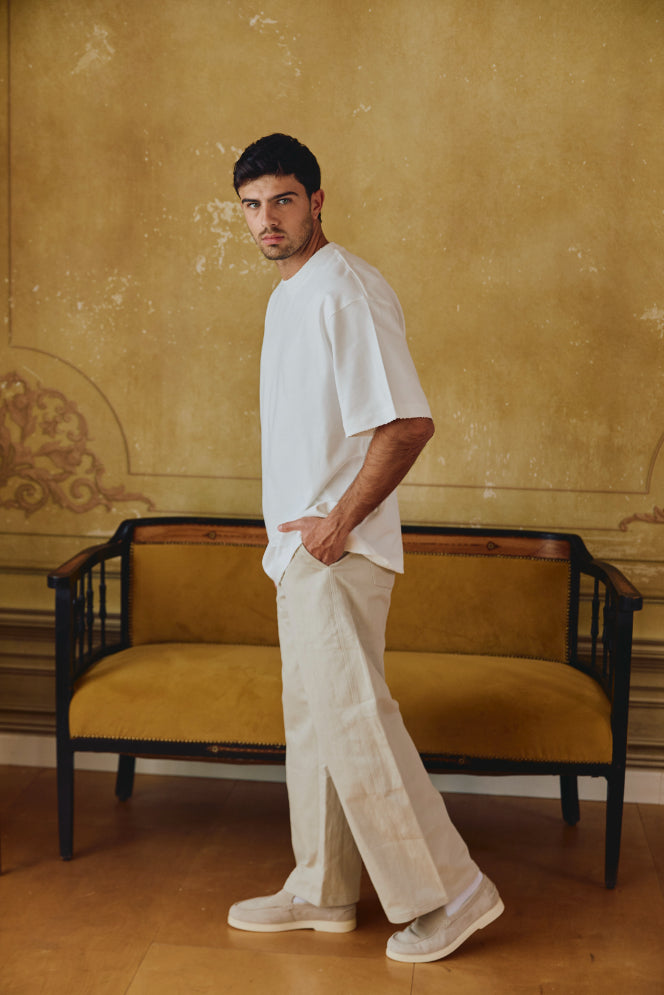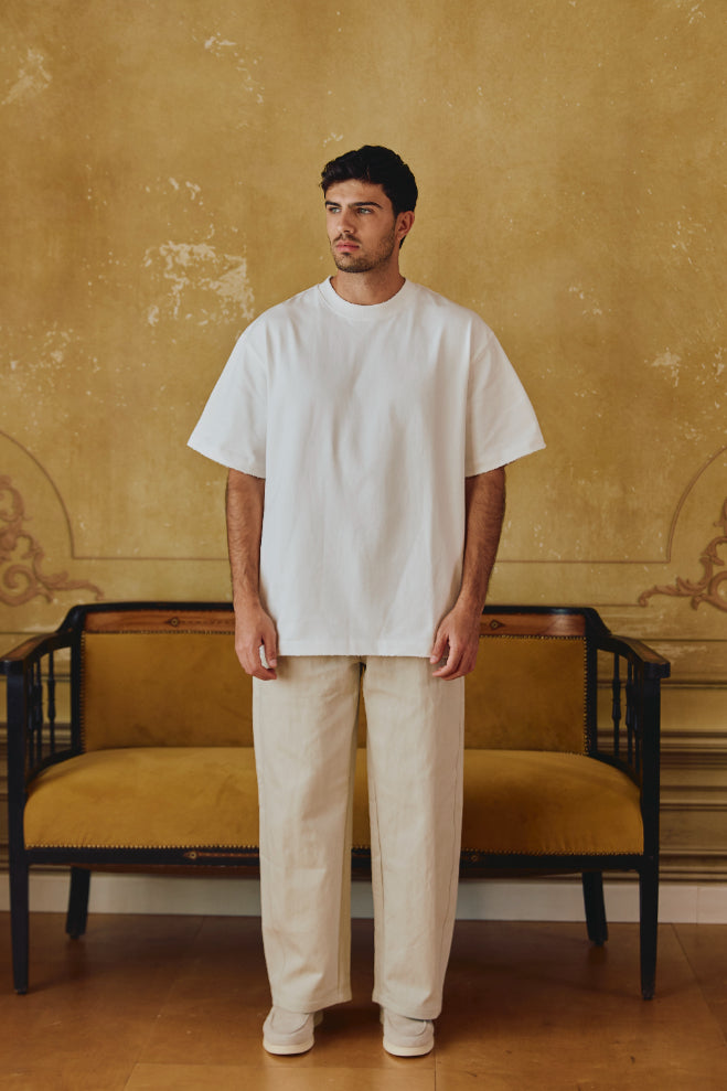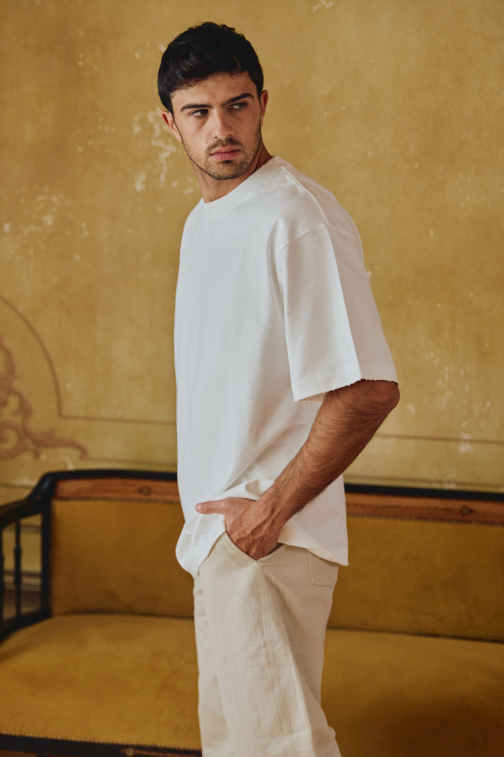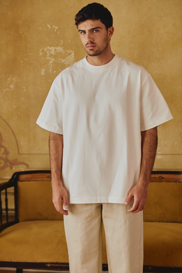 חולצת טי-שירט לבנה בגזרת אוברסייז נינוחה, עשויה בד איכותי עם סיומת גולמית למראה נקי ועדכני