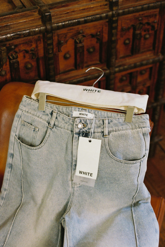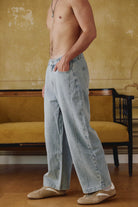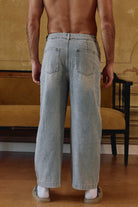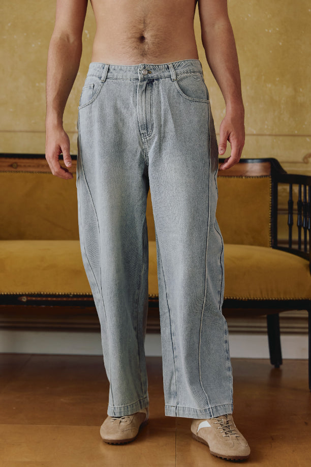 מכנסי ג'ינס בשטיפה בהירה, גזרה רחבה ונינוחה עם תיפורים מעוצבים למראה סטריט-וור עדכני